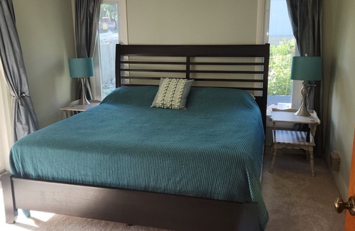 The lower level of the house is perfect for a few guests who may want privacy. With a bedroom, living area, bathroom and laundry, this level had separate walk out to the patio and lake.