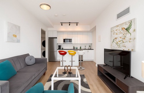 Bright 1 bed, 1 bath condo on the high floor of a brand-new building in North York. Enjoy an open layout with full kitchen, in-suite laundry, linens, fast Wi-Fi, and 24/7 concierge. Just a short walk to Sheppard subway, restaurants, groceries, and parks. Ideal for newcomers, business travelers, or families in transition. Building amenities (gym, etc.) are not yet completed. Available for 28+ night stays only — professionally cleaned and fully move-in ready.