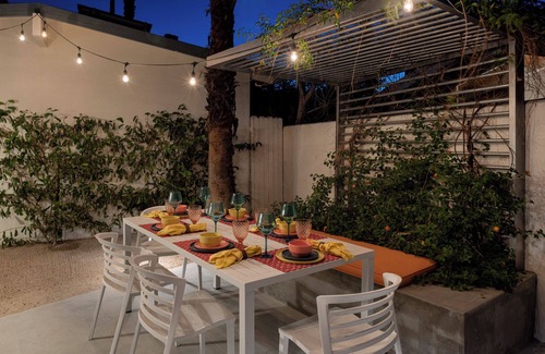 Come enjoy a little slice of paradise in a relaxed, midcentury neighborhood nestled into the San Jacinto hills. This sun-filled, fully restored, 1956 architectural beauty features everything you need to make your stay wonderfully relaxing. Whether you're visiting in the summer or winter, the Blue Mirage has what you need.