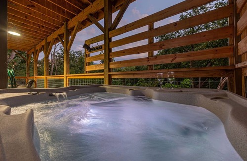 Along with the great location, A Bear's Gatlinburg Splash gives you a taste of luxury on the lower level of the cabin with outdoor seating with a picnic table, cushioned chairs, a hot tub, a charcoal grill, and best of all you can enjoy a private, heated, salt pool all year round.