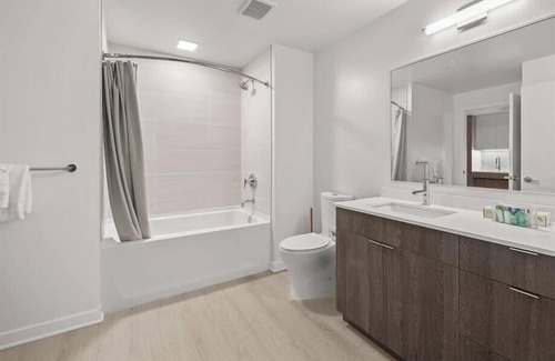 This gorgeous condo features a comfortable sleeping space complete with plush bedding and a walk-in closet. Get a restful sleep in with the bedroom blackout shades and smart locks by Latch that offer privacy, convenience, and security.