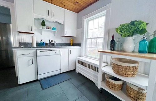 You will enter through the side door facing the driveway into a stylish mudroom with a mini fridge, full laundry, board games, and a seating area. As you continue, you will find a galley kitchen with all of the basic cooking necessities for family meals. Toward the back of the house you will find a 4 season sunroom with a full bathroom (stand up shower), stylish lounge area, and a twin daybed. This room has large picture windows overlooking the cove, a smart TV with cable and streaming capabilities and opens to a back deck with a grill and patio set (in the summer). Beyond the back deck, you will find a spacious backyard with a custom firepit and Adirondack chairs and an outdoor shower with solar powered heat to wash off the sand and sun. The yard has steps down to the ocean/sand area (in low tide). Perfect for kayaking in high tide and walking the large beach at low tide.