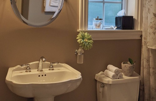 The property is very privately located on a 6 acre serene piece of land. It is gated and has a private paved driveway to the house. The guest suite is separated from the main house by the breezeway where you will be allowed to park. Since the guestroom is not attached to the main house there is a separate entrance to enter the suite. It is a quaint room with a queen size bed, refrigerator, and 42” TV w/ Roku (all streaming apps are installed). The bathroom has a slipper bathtub with host provided supplies.