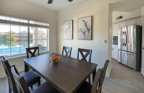 Enjoy Lakefront living in this peaceful 3 bed 2.5 bath home in a gated community in Gilbert, AZ. Community pool and hot tub are just steps away. Enjoy the serenity of the day by the fire pit in your backyard and the reflections of the sunlight on the lake beyond. This quiet neighborhood is perfectly located close to everything! Features two queen beds in separate bedrooms, and one California King with sweeping lake views from the primary bedroom.