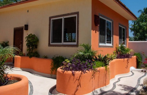 Casita 2 is only 1 square meter smaller than Casita 1, large U shape kitchen & dining area. Comfortable couch. Air conditioning. The tiled bathroom has an unlimited hot water shower. A private terrace is sounded by a vibrant garden wall. . Individual reading lights above the King size pillow top bed. Beach access is directly across the road through our property. Long term rental discounts and free secure storage for your personal property for returning guests. Drinking water, ice, coffee and airport pickup all at no charge. Beach property terrace, loungers, infinity pool, couch, and tables all for your personal use.