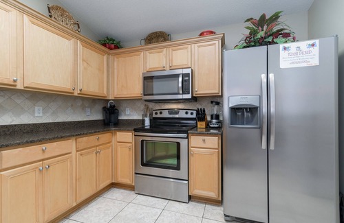 Fully equipped kitchen with Granite and Stainless, French door fridge with 2 ice makers. Separate utility room with full size W/D, Keyless Entry with your own personal code, 2 car garage with key pad so everyone can come and go without keys. For children's safety, house has pool alarm on back door + extra deadbolt up high. SimplySafe alarm on front door for your optional use. 2 sets of garage door openers & community gate remotes provided.
