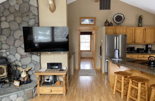 This reverse living floor plan features a great room with vaulted ceilings with lots of natural light. On the main floor (upstairs) you have a great room where the living room, dining area, and kitchen are all open. All the windows overlook common space on 3 sides of the home. There is a wood stove (wood provided) for those cold winter evenings or turn on the air conditioning for those hot summer afternoons. There are four TVs with Netflix, a Blu-Ray/DVD, and a movie collection along with board games. We also have a bluetooth Stereo/CD. This home comes with ultra fast 300MB high-speed wireless internet with mesh wifi that provides a strong signal throughout the house. The large wrap around deck will keep you in the sun or shade the entire day. There is a Weber gas barbecue, umbrella table and plenty of seating along with the hot tub on the deck.