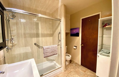 The lower level studio opens onto a deck with our vegetable garden and spacious patio. The kitchenette has a sink, microwave, toaster oven, mini-fridge, double hot plate, blender and coffee maker. Fold down Murphy bed with very new Avocado queen mattress. Bed has a simple desk built in when it is folded up. There is a "Design Within Reach" couch that converts into a very comfortable king-size bed (or can be used as a twin), and the large private bathroom has a walk-in shower with seat. There is a gas wall heater that you control. There is no entertainment system or TV. For the eco-conscious and chemically sensitive: the flooring is recycled cork, paint is zero-VOC, sheets and towels are organic, and all cleaning supplies we use are non-toxic. Free very fast wireless.