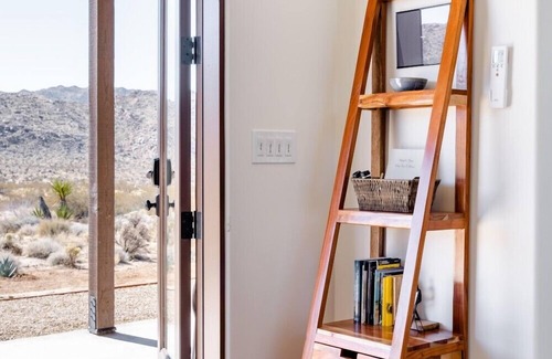 Quails Nest Joshua Tree by Homestead Modern is a romantic desert retreat located just minutes from the entrance of Joshua Tree National Park. This peaceful getaway offers sweeping mountain views and soft desert light, making it an Ideal hideaway for couples seeking tranquility and connection. Guests can start their day enjoying coffee on the patio, unwind with a private soak in the hot tub, and end the evening stargazing under the expansive desert sky.