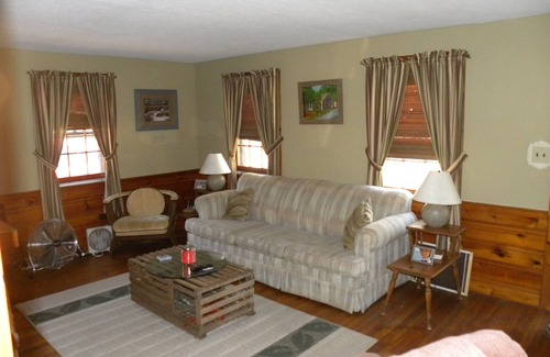 The cape cod getaway house is situated in a quiet area approx. .4 miles to south shore beaches, playground for the kids, fishing, boating , jet skiing, parasailing etc. there is a brick patio with an enclosed gazebo, and dining table that seats 6, gas grill, outdoor shower, and a firepit to cook smores with the kids, the house has 2 bedrooms one has a queen size bed, the other has 2 twin beds, one tile bath with tub/shower. the living room has a pull out couch, recliner, 40'' flat screen tv , fireplace, and window ac unit.