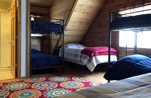 The cabin has 2 bedrooms and a full bath on the main floor as well as a loft that sleeps several along with its own bathroom. The kitchen comes equipped with anything you’ll need to make meals at home.