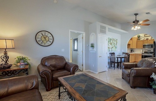 Featuring high-end furnishings and tasteful decor, this charming Mesa getaway is adjacent to a quiet neighborhood park, providing a serene atmosphere for relaxation. The open living area boasts comfortable seating, a vaulted ceiling, a large TV, and inviting decor, perfect for a cozy movie night in.