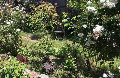 The bedroom has a queen bed. The (larger) sitting room has a single bed, which looks sort of like a sofa, as well as a real sofa. Both rooms look out at the garden. Powder-room-size bathroom with walk-in shower. WiFi. Cable TV with Netflix et al. Wood floors.