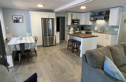 The house has an open living and kitchen floor plan with updated bathrooms. A fully equipped kitchen with dishwasher, microwave, stove, side-by-side refrigerator. There are two smart TV’s, one located in the living room and the other in the bunk room.
