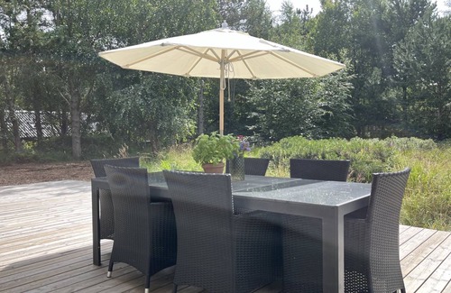 Single-family house, built in 2001. 600 m from the sea. Private: natural state property 2'000 m2. Terrace (100 m2), children's playground (swing). In the house: sauna, washing machine, tumble dryer. Parking at the house. E-charging station. Grocery 1.2 km. The owner does not accept any youth groups.