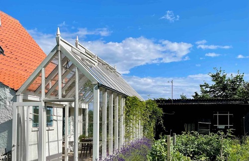 Behind the house, you'll find a secluded garden brimming with charm and coziness. Here, you can enjoy old fruit trees, a beautiful 20-square-meter orangery, a playhouse in the apple tree, a swing, a hammock, and raised beds filled with herbs and tomatoes in the greenhouse. In front of the house, a large private natural area stretches out, where you have access to private parking, a mini-harbor, and a bathing ladder attached to the cliffs. Here, you have the opportunity to use the Baltic Sea as your own private pool. The harbor is ideal for kayaking and SUP boards, and the small ponds among the cliffs provide perfect conditions for children to swim and catch salamanders.