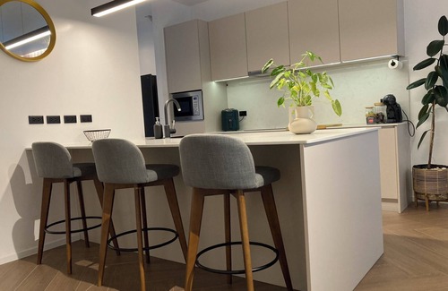 Dishwasher, full oven, microwave, island with stools, Dolce Gusto coffee machine & airfryer.