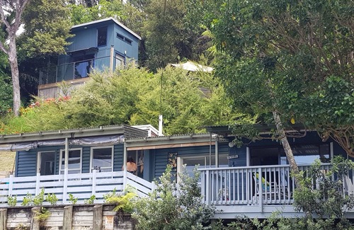 Lovely main home nestled in the beautiful forest of Nikaus and palms. Short stroll to beach, great walks, great snorkelling and fishing and kayaking. Home has all essentials for cooking, barbequing and layzing in the sun. Upstairs Cabin with breathtaking views to Lion Rock and Great Barrier Island with Birdsong. Upstairs deck for entertaining and sunning. Small cafe down road great for coffees and lunch and spa is you want creature comforts. Main house and cabin for great family times.