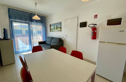 Two-bedroom apartment for up to six guests, situated on the first floor of a one-storey house without lift, only 240mt from the beach. It features a kitchen and eating area, a balcony, a living room with a double sofa bed, a double bedroom, a bedroom with two single beds, and a full bathroom with a shower box. One uncovered parking space is included. There's a shared laundry room for the whole residence. A/C is available at an additional cost (check below).°Photos are generic and representative of the accommodation type (furniture, décor and colors may vary)