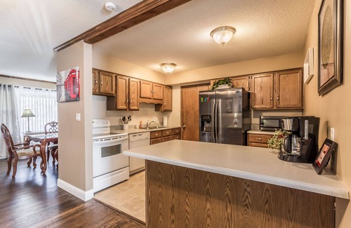 Charming single family house conveniently located just couple blocks from Overland Park Downtown. Nicely decorated house offers specious and comfortable accommodations for small or large groups, wedding guests, family reunions or couples spending weekend away from home. New furniture, freshly laundered bedding and towels, it has everything you need for your stay. Close to Highway 69 and I-35, 20 mins from KC downtown, P&L, etc. The main level features a kitchen with nice sitting are, formal dining area, open living room with access to outdoor deck and two sofa-beds, 3 bedrooms and 1 full and 1 half bathrooms. The lower level offers a huge bedroom with king size bed and a futon and another living room with sofa-beds.