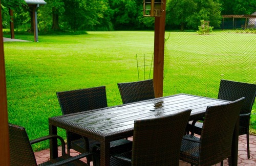 The cottage is designed around an open space concept- all in one room with separate bathroom. You have a full cooking/dining area, TV nook, and queen bed. Of course, the bathroom is separate and has a door. Outside, our guests have access to the outdoor kitchen/bbq, Gazebo (with fireplace), Pergola, and pool.