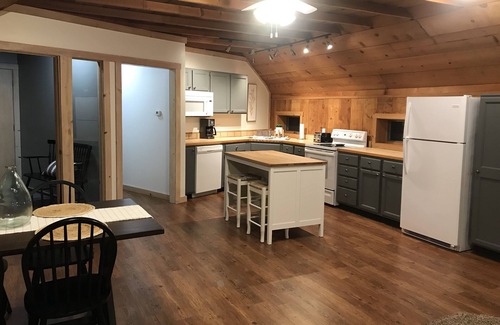 Looking for a quiet place to stay in the country? The lodge offers 1300 sq ft of living space, a spacious fenced in backyard, washing machine and dryer, spacious bathroom, and full kitchen. The bedroom offers a queen size bed with comfortable bedding, a large closet to store your clothes, and 2 sitting chairs. In the kitchen area you'll find a full-sized kitchen complete with a pantry, dishwasher, microwave, oven, and stove. The island provides the perfect spot to enjoy your breakfast or morning cup of coffee. You can also enjoy your meals at the dining table. In the living room you can relax on the couch or recliner chairs, and there is room for kids to sleep on the pullout couch. In the summer months you can enjoy preparing your food on the barbecue and relax in the backyard. A starter set of toilet paper, paper towels, dish soap, and dish pods will be supplied at check-in.