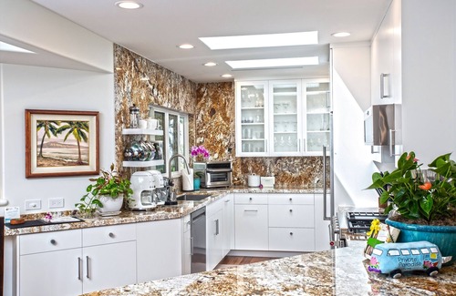 The kitchen is stocked with all new cooking, dining and serving items including crystal bar ware, and Hotel Collection bone china. There are abundant serving bowls and platters for family dining. To create memorable island dining in your own private paradise, we purchased abundant small appliances for your convenience. In the kitchen is a rice cooker, waffle maker, roasting pan, espresso machine, dual coffee makers with grinders, french press, blender, mixer, juicer, salad spinner, and All-Clad cookware.
