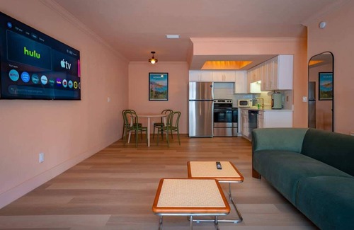 Open dining and living areas with modern-retro decor, comfortable seating, and a Smart TV