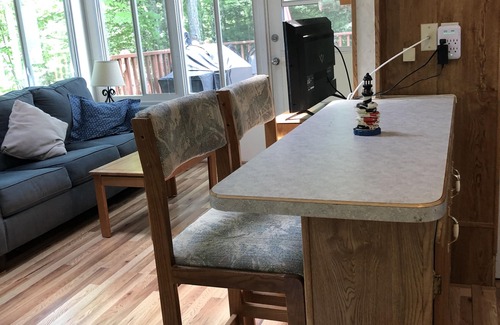 Our cottage is perfect for couples and for families. The sunlit living room includes a new pull-out couch, a new recliner, and flat screen TV. The dinning area features a table large enough to seat everyone. The master bedroom has a TV and ample closet space and provides a view of the woods and wildlife beside the golf course. The second bedroom offers two twin beds and a small TV. The kitchen is fully equipped and features a quaint breakfast bar.