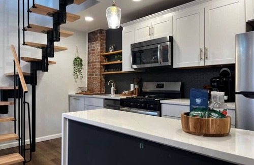 Welcome to our designer high-end space with an open concept living room and kitchen area. The industrial spiral staircase leads to an expansive loft bedroom with a workspace and en suite half bath for your convenience. Stay entertained with smart TVs and high-speed WiFi. The main floor offers a full bath with a large tiled shower, and we provide full-size toiletries and plush linens. Exposed brick and the art deco mantle add character. Natural light creates a warm atmosphere.