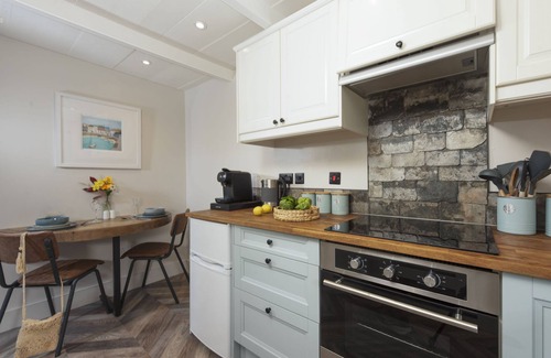 Next, discover the gorgeous kitchen area, with a half round table for intimate dining. With wooden worktops and dusty blue cupboards, you'll find everything you'll need and more in this charming kitchen. Including an electric oven, induction hob, fridge/freezer, dishwasher and L'OR coffee machine. Pop on the Roberts Radio and enjoy sipping your morning coffee with the one you love. The sitting room exudes an irresistibly cosy ambience, with a warming wood burning stove, casting an atmospheric glow during those out of season escapes. The furniture is crafted from responsibly sourced reclaimed timber and embodies eco-conscious luxury, offering a bespoke feel. The comfy olive green sofa is perfect for evenings snuggled beside flickering flames and the cute window seat is a lovely spot for holiday reading. There is a full HD Smart Television which enables you to access your own steaming accounts such as Netflix, Amazon, Disney+ and Apple TV.