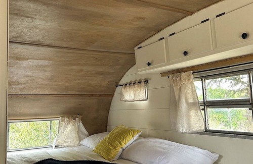This completely remodeled camper is a 1957 Camper named Donna designed with a unique blend of mid century and farmhouse. Immerse yourself in the ultimate glamping experience with King size bed (bedding included), night stand, small table and 2 chairs. With the comforts of air conditioning, heating, and electrical outlets for cozy camping experience.
