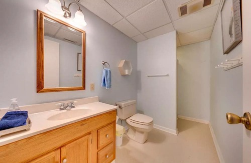 In the basement, you will find a 3rd bedroom with a queen bed and twin bunk beds, and a older style Roku tv. There is a second family room with sofa, tv, and a desk with extra computer monitor for working. There is a game room with a foosball table, dart board, and a table for working puzzles or playing games. There is a full bath (shower) and a laundry room also in the basement. There is an exterior door in the downstairs family room.