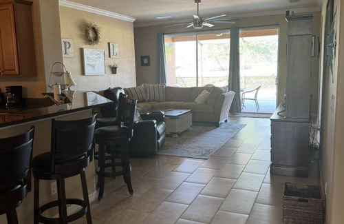 Curl up and relax in the cozy living room on the large sectional sofa or comfy recliner while watching tv or reading a book from our fully stocked bookshelf. Just off the living room through the sliding door is a covered lanai with more seating and a heated pool. You can enjoy the beautiful weather while dining al fresco or soak up the sun in a lounge chair.