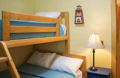Upstairs, the master bedroom opens up into the loft area which overlooks the living room while providing a panoramic view of the river. This area is a great spot to curl up with a book or to just sit back and enjoy the scenery through the floor- to- ceiling windows. A small bathroom and a second bedroom with a captain's bed is tucked away on the back half of the cottage. This is a great set-up for families with small children who want to be within earshot of their bedroom.