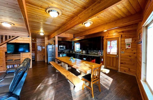 Full size kitchen includes multiple sets of dishes, utensils, pots & pans etc. Feel at home while you dine at your 11ft custom log dining table.