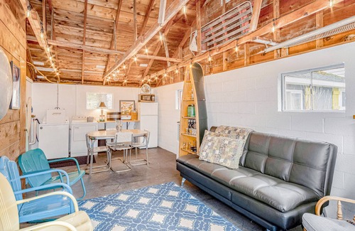 If you're looking for a hip and chill change of scenery where you can entertain, play together, or just relax by the water, this colorful riverfront cabin should fit the bill! Outside, you'll find a shared riverside deck with a table and chairs, a firepit, and a variety of watersports accessories, including adult and junior kayaks, two beach bikes, inflatable tubes, and skimboards. This adorable, single-level home includes a well-equipped, full kitchen for whipping up your favorite recipes or reheating last night's leftovers, a dining area with a stereo and turntable for spinning your favorite records, a sunlit living area with a sectional, Roku-equipped TV, gas fireplace, and a large selection of books and games, and a furnished, bonus room in the garage with a second refrigerator, microwave, and TV.