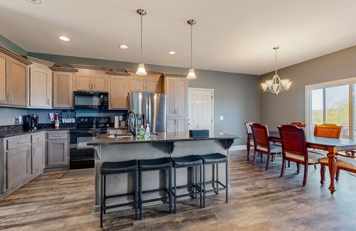 As a newer build, the house is full of large rooms and open, airy spaces. There are so many areas for gathering, including the great room with plenty of natural light, the eat-in kitchen complete with stainless steel appliances, and the den. Start each morning with a workout on the elliptical machine in the fitness room, and end each evening playing board games, streaming movies, arcade games, or telling stories by the fire in the great room. There's also a 30 foot RV pad with full hookups (water, 50 amp electric hook up, sewer).