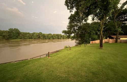 This property has a large VERY PRIVATE backyard overlooking the Brazos River with firepits and hammocks. You can get close to the bank however no access due to steep bank for swimming/fishing. There is a boat ramp down the street for boat/fishing access.