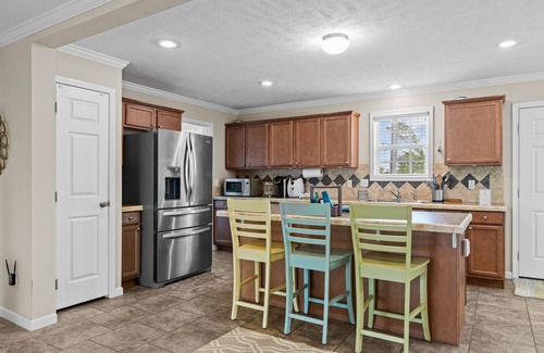 Surrounded by lovely floral blooms, the exterior of this home is just as charming as the inside. Walk inside and you'll instantly take notice of the spacious living room's comfortable seating and large TV. The adjacent full kitchen presents a pleasant space to play chef amongst the stainless steel appliances, ample meal prep space, and center island.