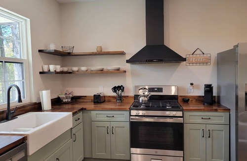 Book your relaxing private getaway in this beautiful new build! This cabin seated on the river offers beautiful nature views through picture windows around the fireplace. Sleeping available for up to 6 guests, with 2 queens bedrooms and a queen sleeper sofa in the living room. Extra amenities include a smart tv, wifi, white noise machines to ensure a soothing nights sleep, keurig coffee maker, books, games, and all the basics for cooking a meal while you make yourself at home. A pack n play with mattress, and plastic dishes are included as well to provide a family friendly stay for the little ones.