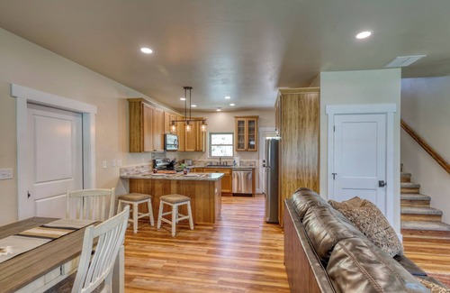 Open concept design for easy relaxation. Integrated living, dining, and kitchen area with large flat-screen TV and streaming