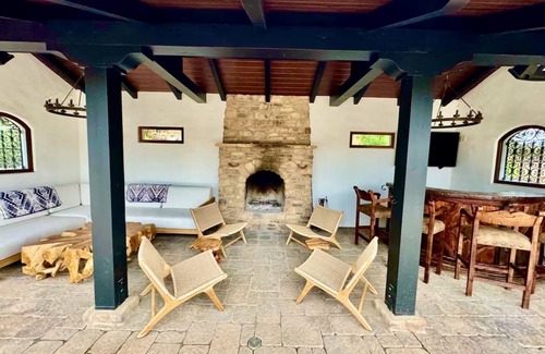 Our home celebrates indoor-outdoor living with an inviting front porch that draws you out to the garden and centuries-old Oak trees. Once outside you'll find the heated pool and spa and open-air pool house: complete with wood burning fireplace, large umbrellas, lounge furniture, a hand-carved bar with stools and an outdoor tv. Lush pool towels and floating noodles are provided.