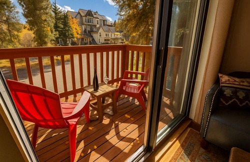 Enjoy Colorado sunshine in this stylish studio with a king bed, hand-scraped maple floors, and a south-facing deck. Ski in via Four O’Clock Run and walk just 200 steps to the Snowflake Lift. Only two blocks from Main Street, with pool and hot tub access nearby.