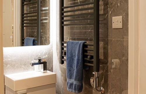 Both bedrooms are furnished with plush double beds, ensuring a restful night's sleep. One of the rooms also features a dedicated desk, catering to remote workers and business travellers. The main bathroom, equipped with modern fixtures, promises a refreshing start to your day.