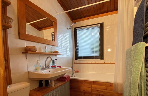 1 separate bedroom with 2 beds of 90 cm, chest of drawers, velux with beautiful mountain views. Access by a ladder.