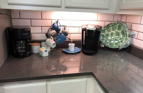 The large primary suite includes a comfortable seating area with TV, as well as a functional, comfortable work space/desk. A comfy recliner is great for napping, reading or TV time, and the twin size love seat is also a twin fold-out bed. The walk-in closet is big enough for a Pack-n-Play (which we keep on sight for your use). Cozy enough for a couple, or bring the family.