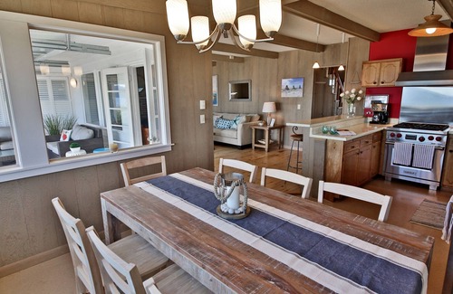 There is a large dining table that seats 8 as well counter seating for 4 in the kitchen. The living room has french doors that open up to a sun room. The sun room has garage style doors to create an 'outdoor' space when the weather is nice.