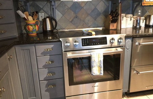 This beautiful condo has a unique open floor plan with top-of-the line Bosch appliances in the kitchen, including range, oven, and under-counter fridge. There’s a microwave, coffeemaker, even a wine chiller and stocked spice rack.