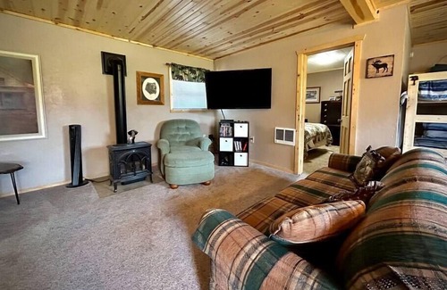 Sarge's Cabin is a small home with big personality. There is one main bedroom with a queen sized bed and a set of twin bunk beds. The full kitchen is just off of the living room and dining room.
